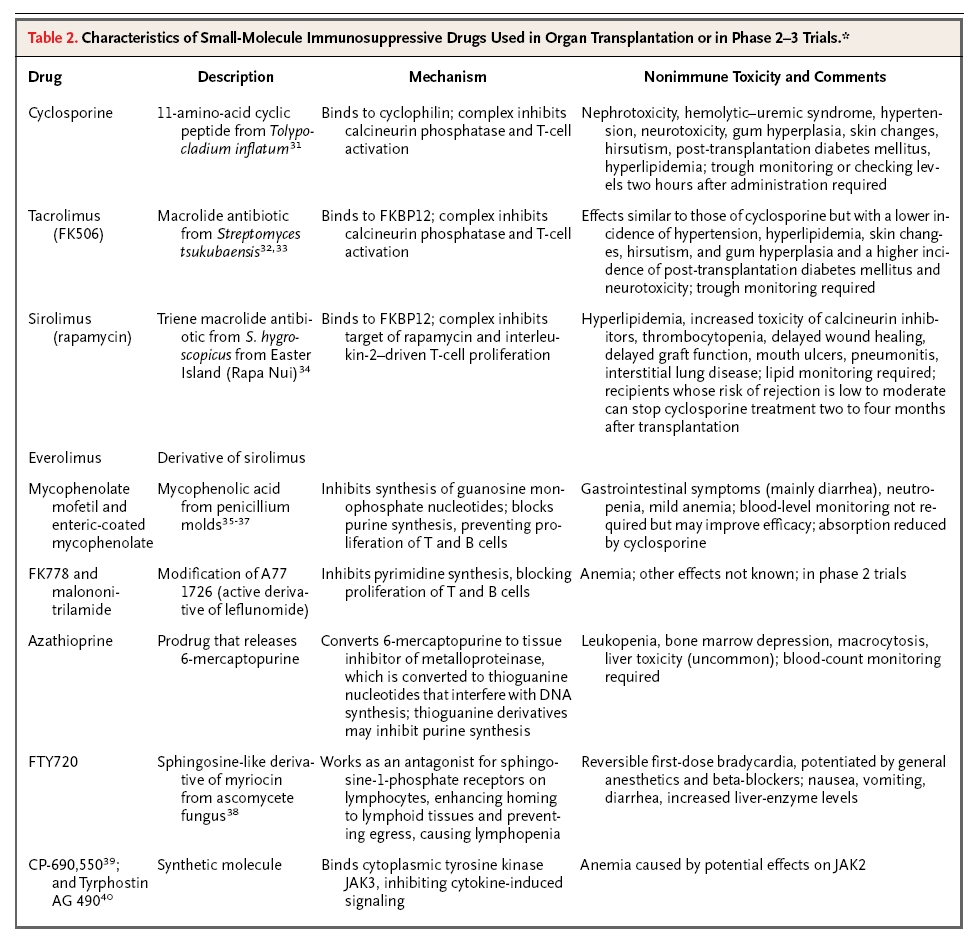 Summary of immunosuppressive drugs used in organ transplantation Source: N Engl J Med 2004; 351:2715-29